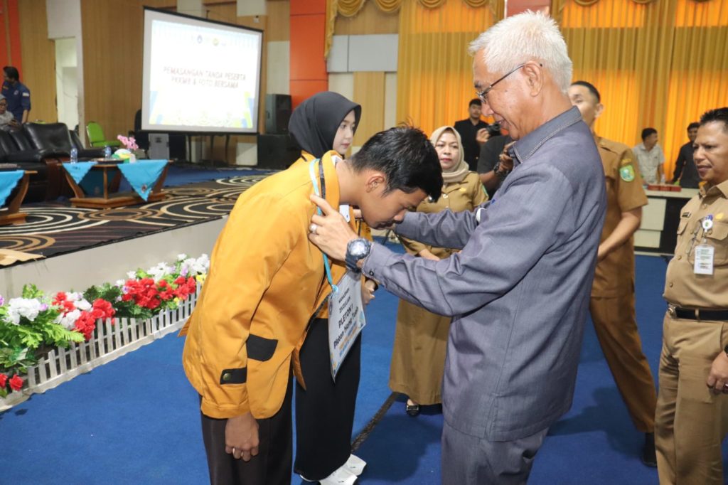 Setelah seremoni sambutan, dilakukan pemasangan jas almamater dan penyematan tanda peserta PKKMB Tahun 2025 kepada perwakilan mahasiswa yang dipilih.